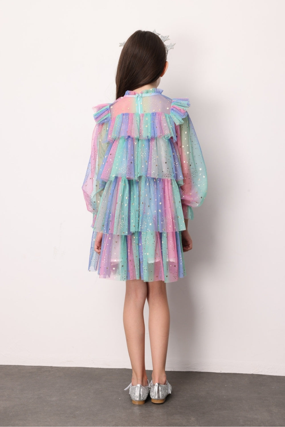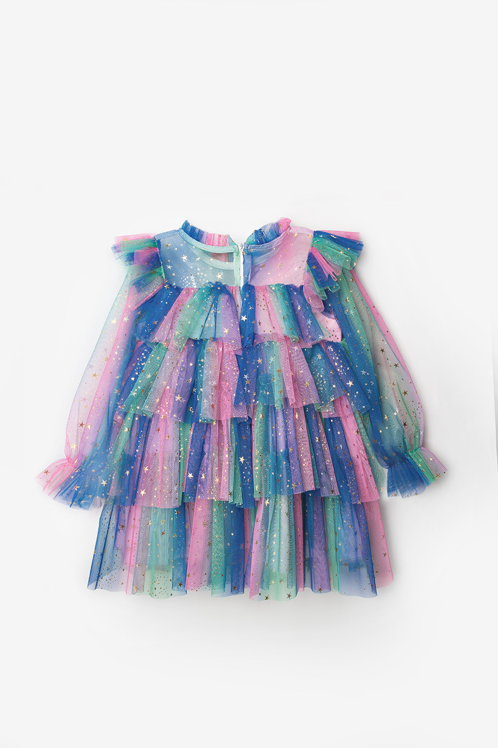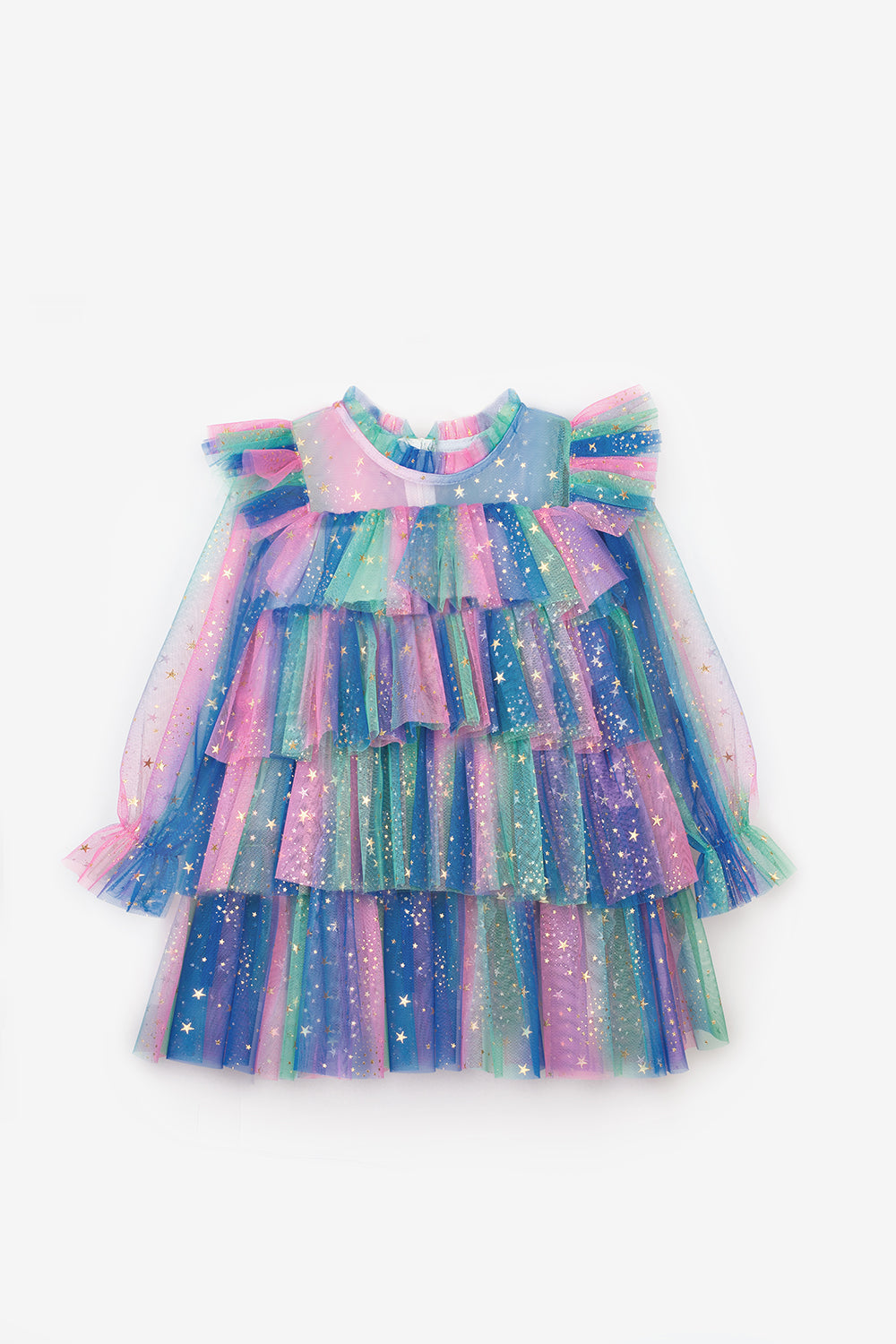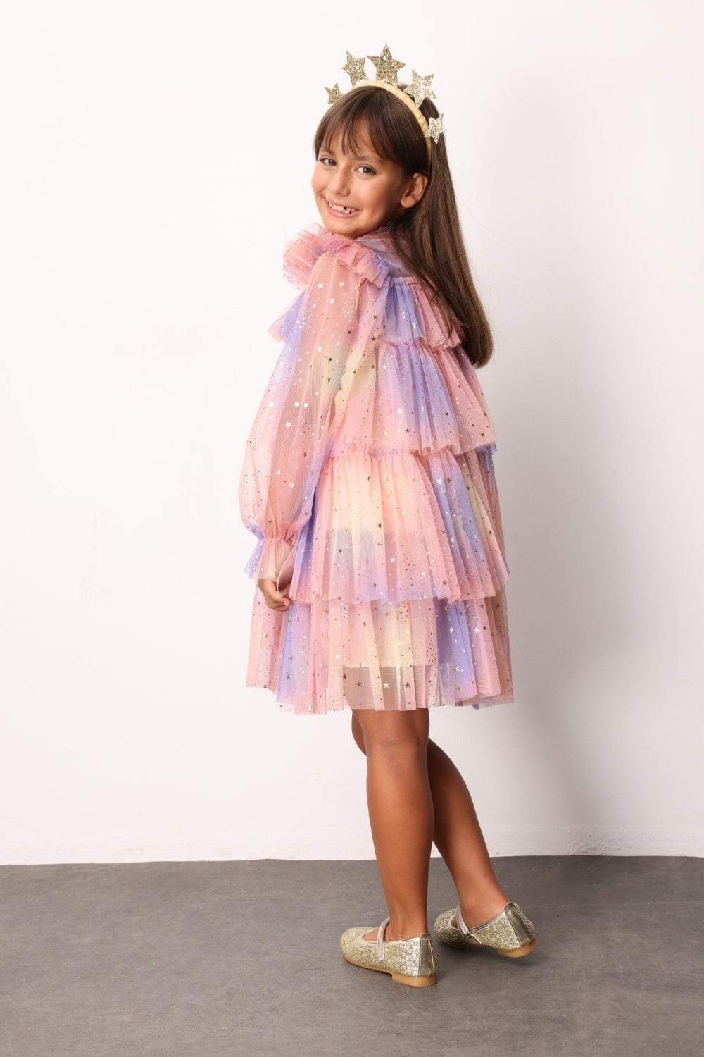 Çok Renkli Varak Yıldız Baskılı Katlı Kız Çocuk Elbise - Chloe