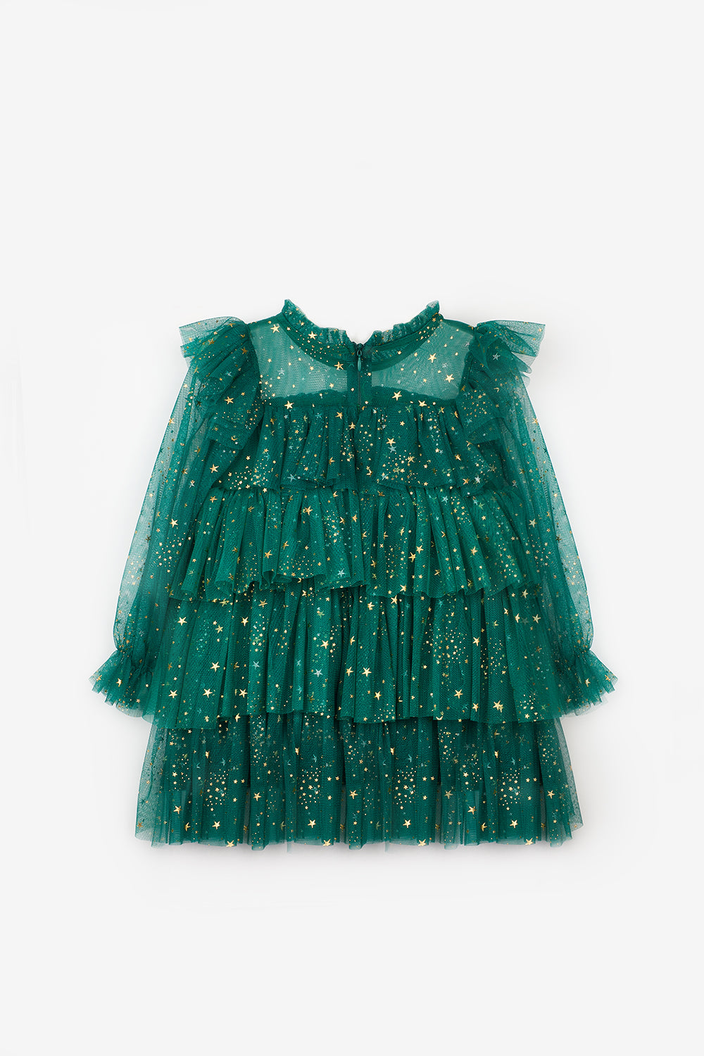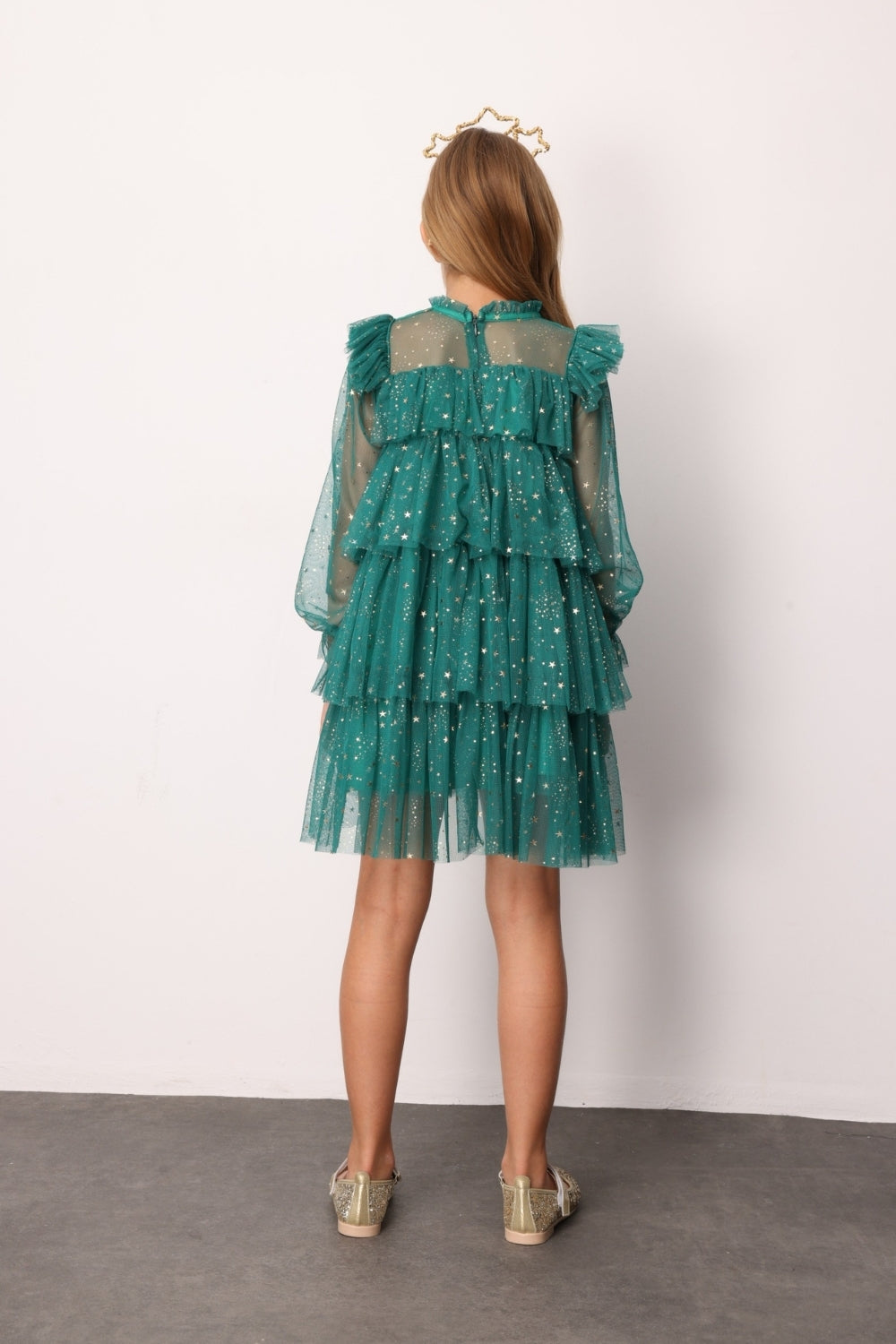 Yeşil Varak Yıldız Baskılı Katlı Kız Çocuk Elbise - Chloe