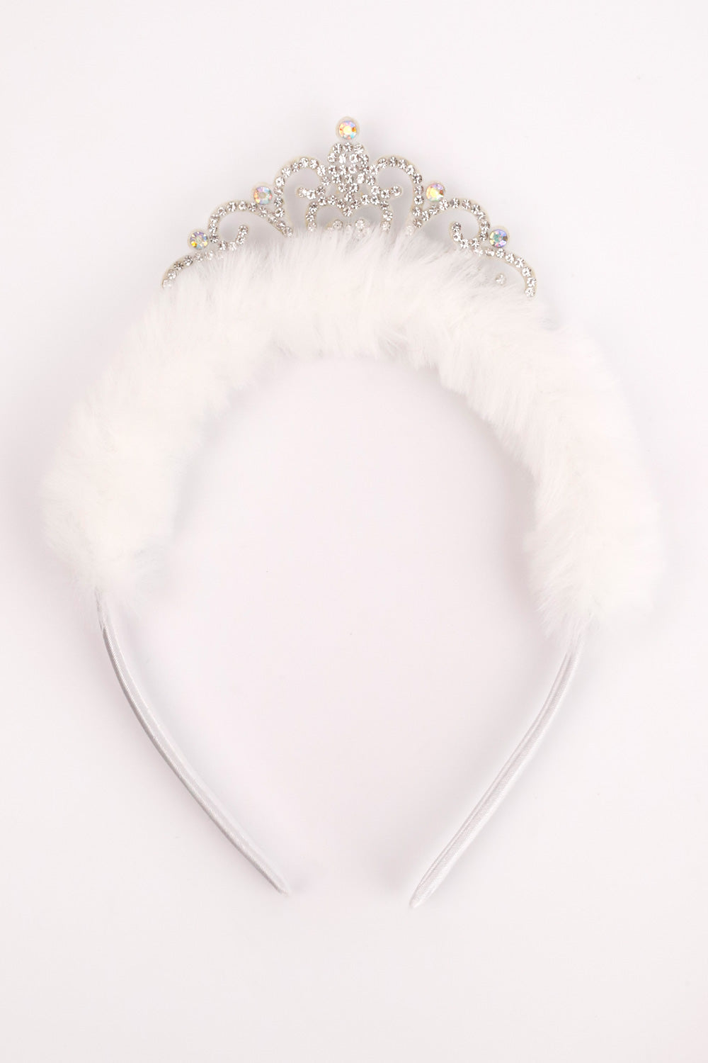 Beyaz Tüylü Taşlı Kraliçe Kız Çocuk Taç