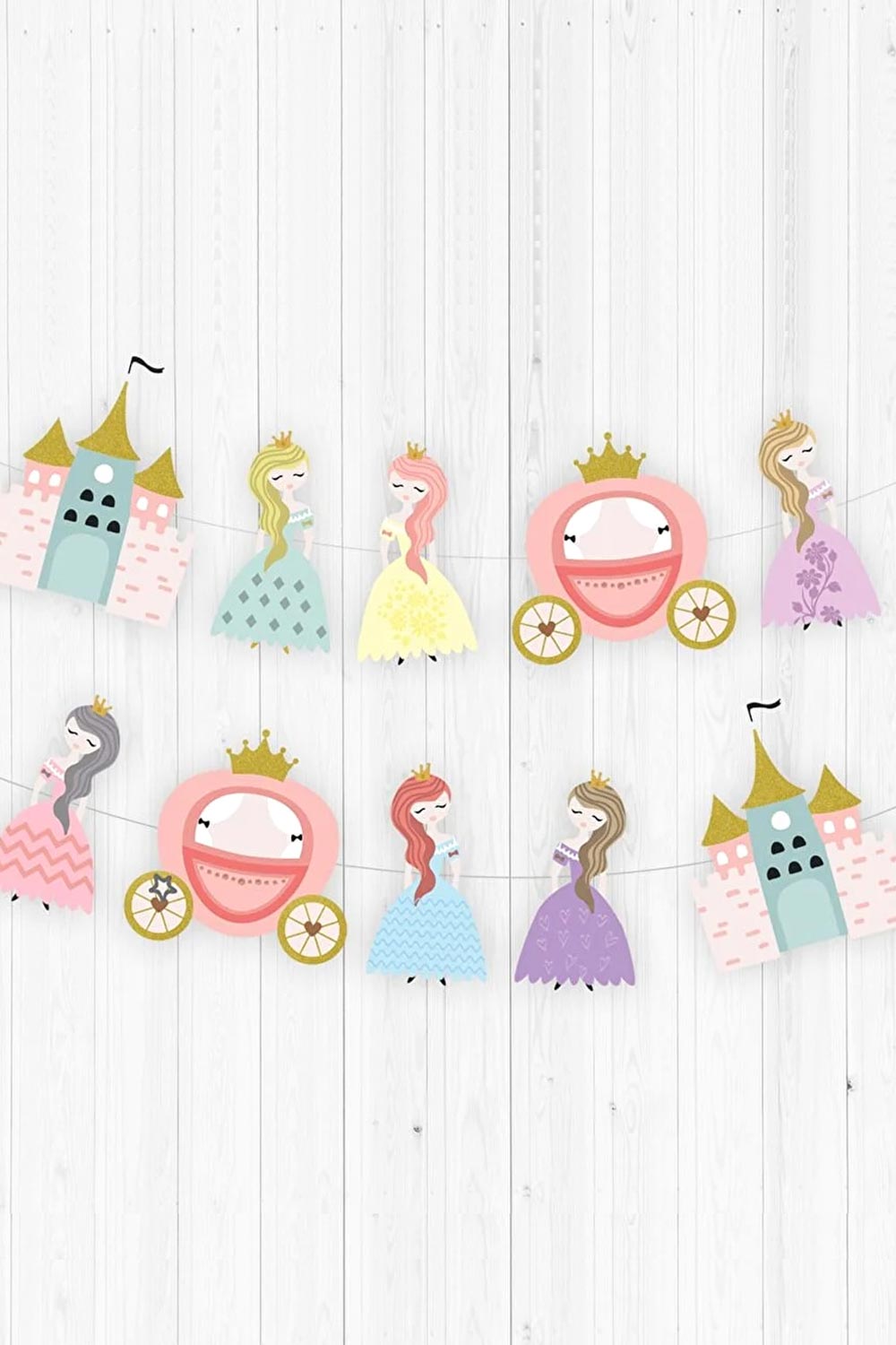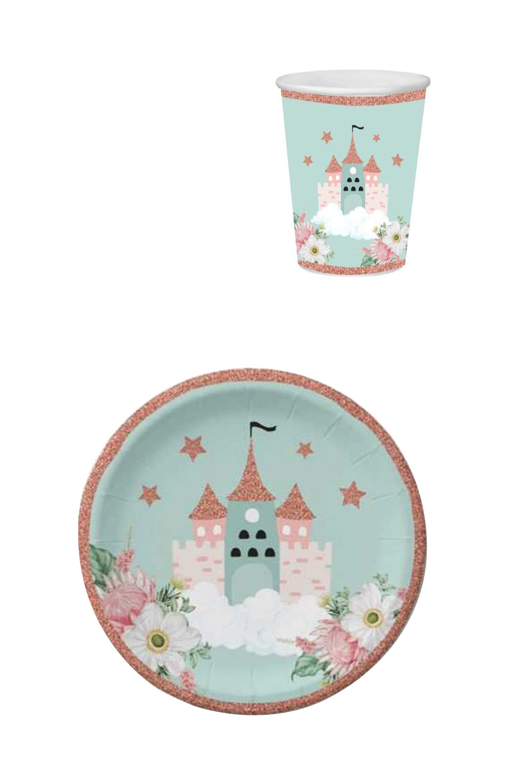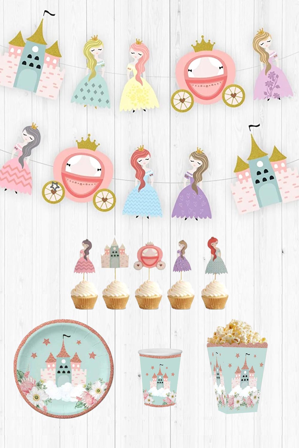 Princess and castle themed party set consisting of cake pick, glass plate, banner and popcorn box