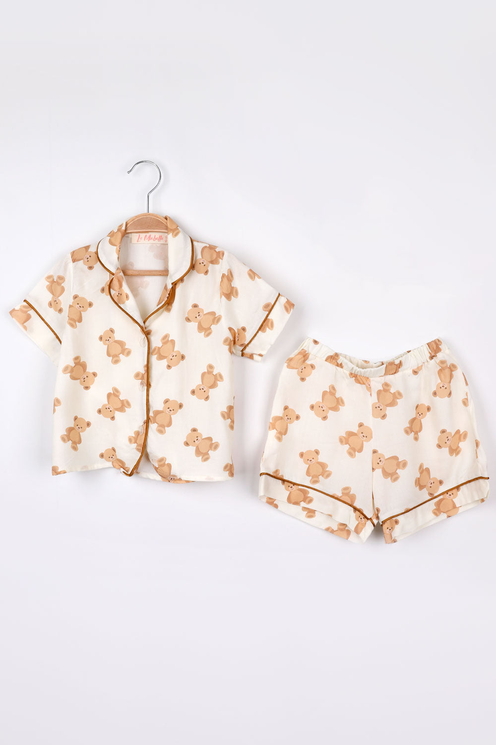 Ecru Teddy Bear Patterned Bias Tape Girls' Pajama Set