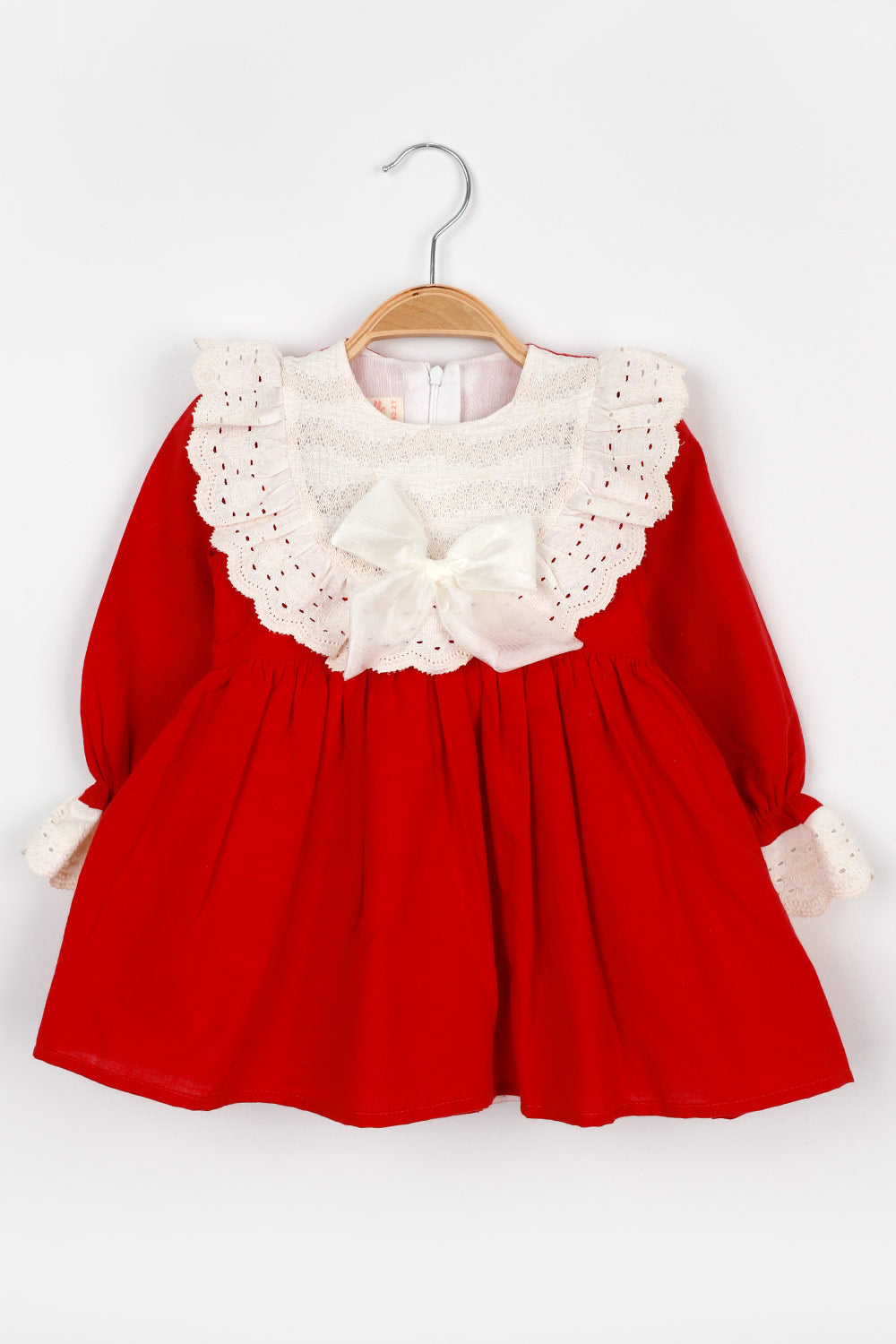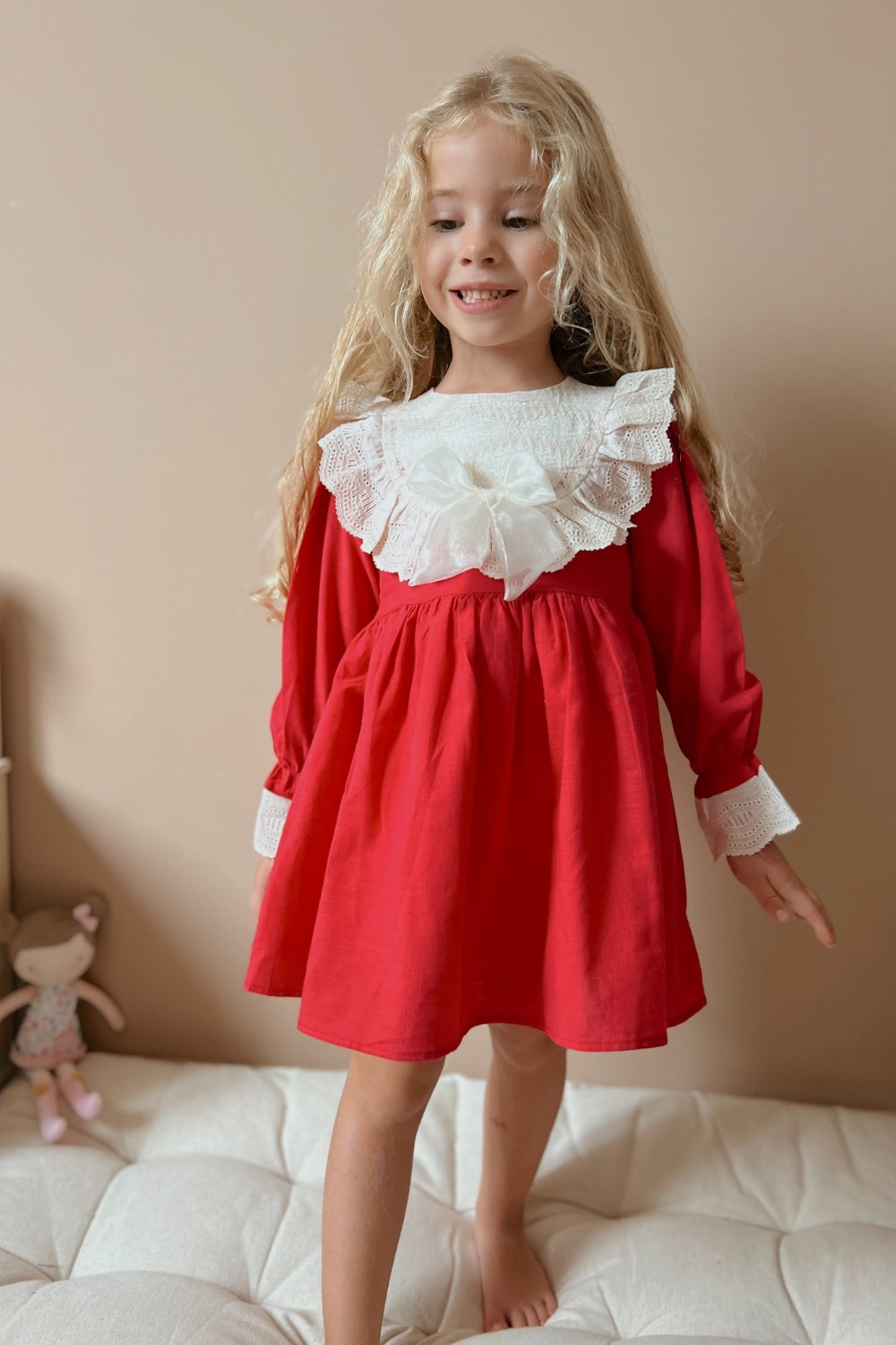 Red Scallop Collar Linen Girl's Dress - Trinetta