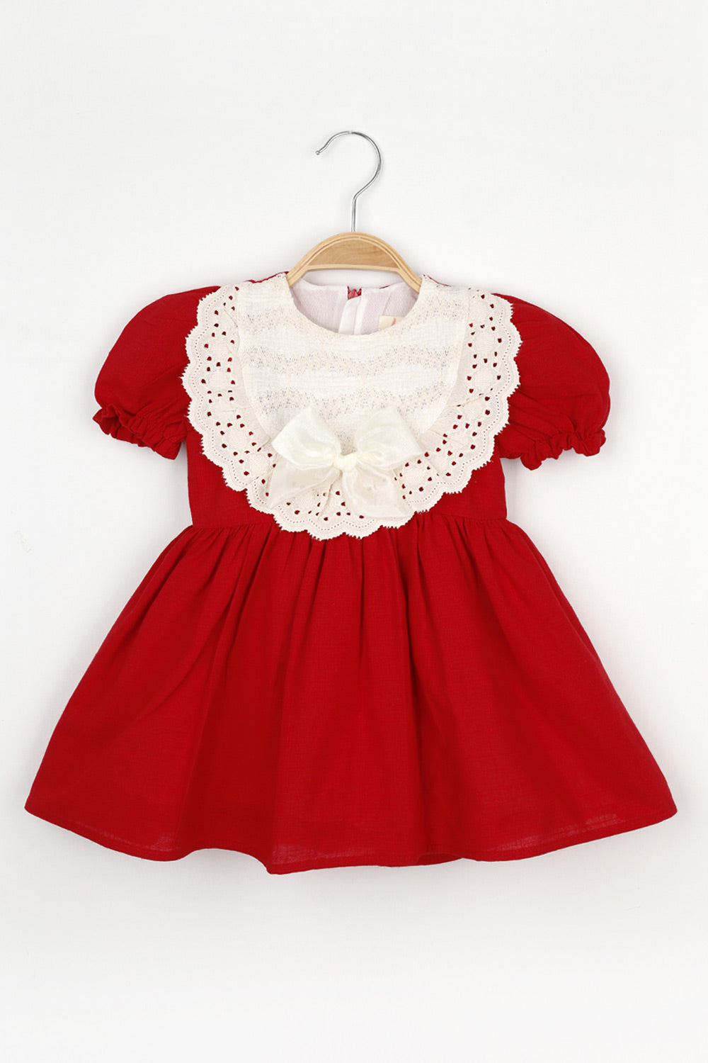 Red Short Sleeve Scallop Detailed Bow Girl's Dress - Rosa
