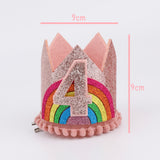 Baby girl queen crown with numbers on the front and a glittery rainbow detail and clip buckle