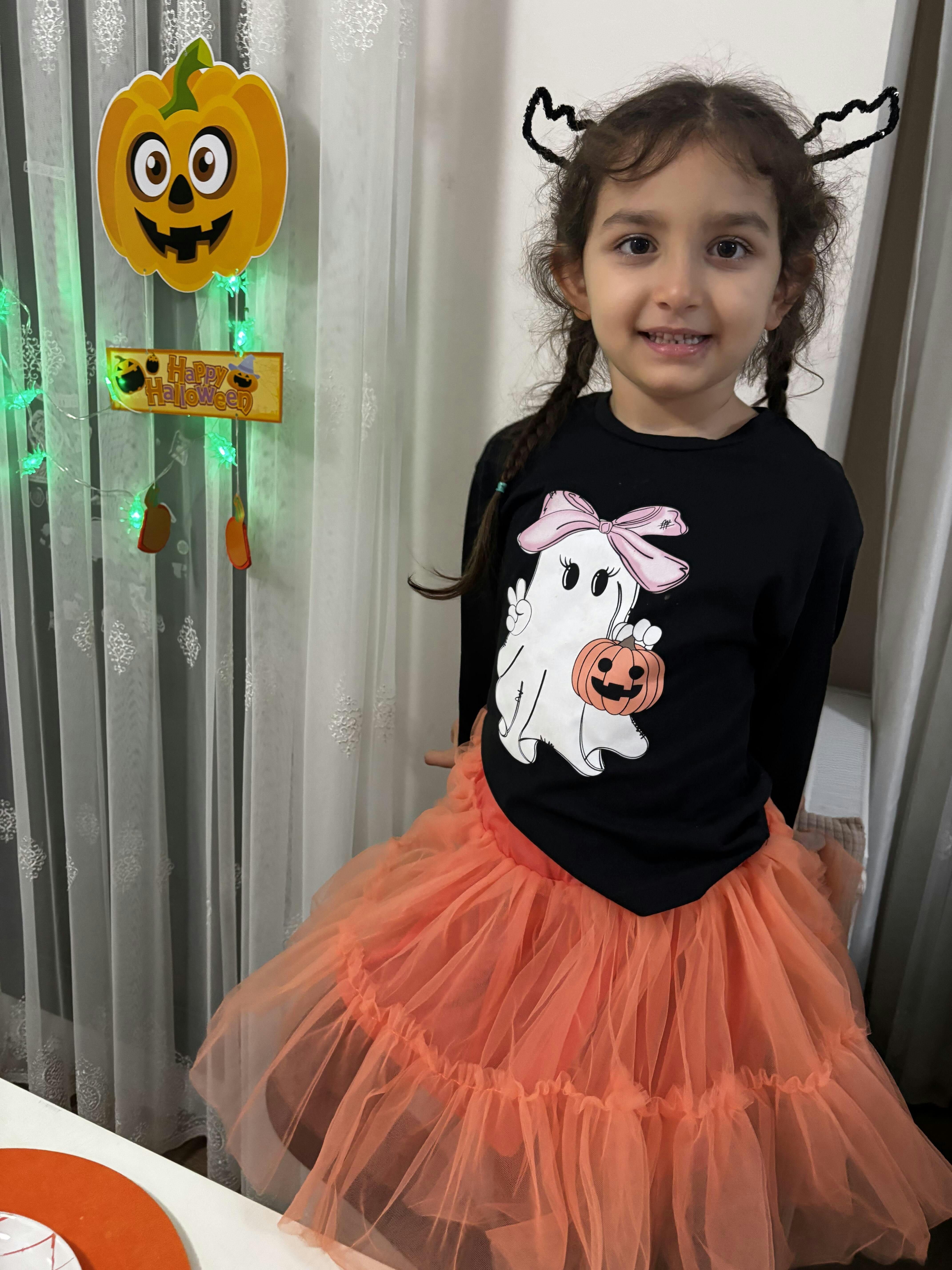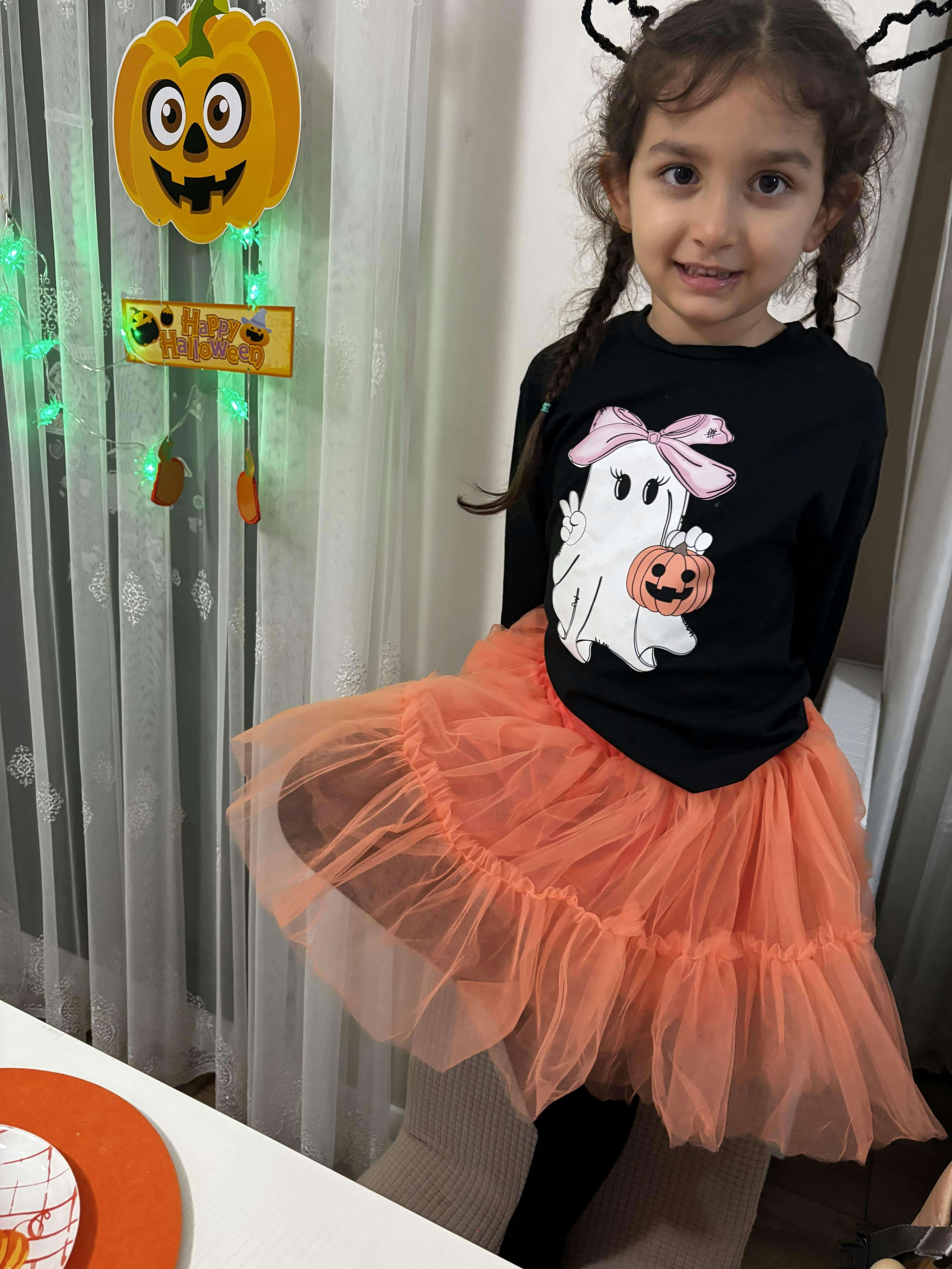 This t-shirt, which captures the spirit of Halloween with a charming touch, is sure to be a favorite with little ones! The adorable ghost print on the front and the sparkly glitter details surrounding it add a dazzling and playful touch. This stylish and comfortable piece combines the Halloween theme with a modern touch. The t-shirt is made of 94% cotton and 6% lycra combed cotton.