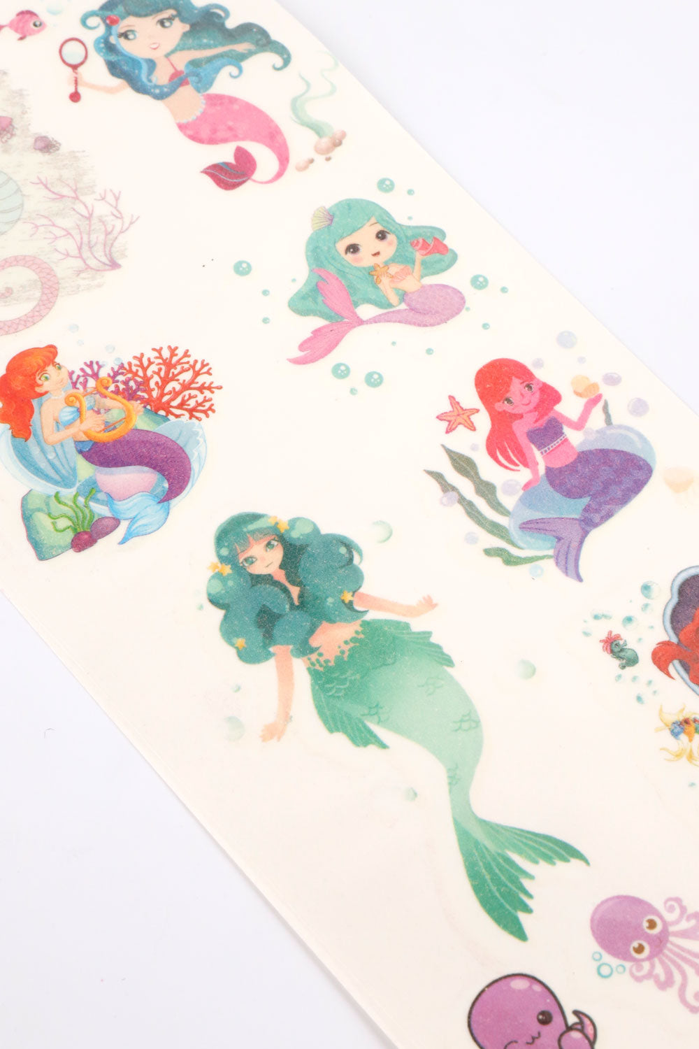 Çok Renkli Deniz Kızı Temalı Kız Çocuk Dövme, küçük prenseslerin doğum günü partilerine renk ve eğlence katmak için özel olarak tasarlanmıştır. Çocukların keyifle kullanabileceği bu dövmeler kolayca uygulanabilir ve çıkartılabilir.