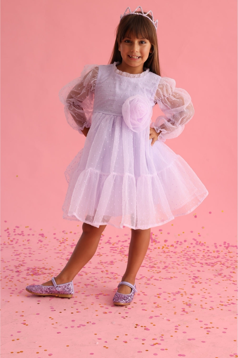 Lila Puantiyeli Gül Aksesuarlı Kız Çocuk Elbise - Belinda