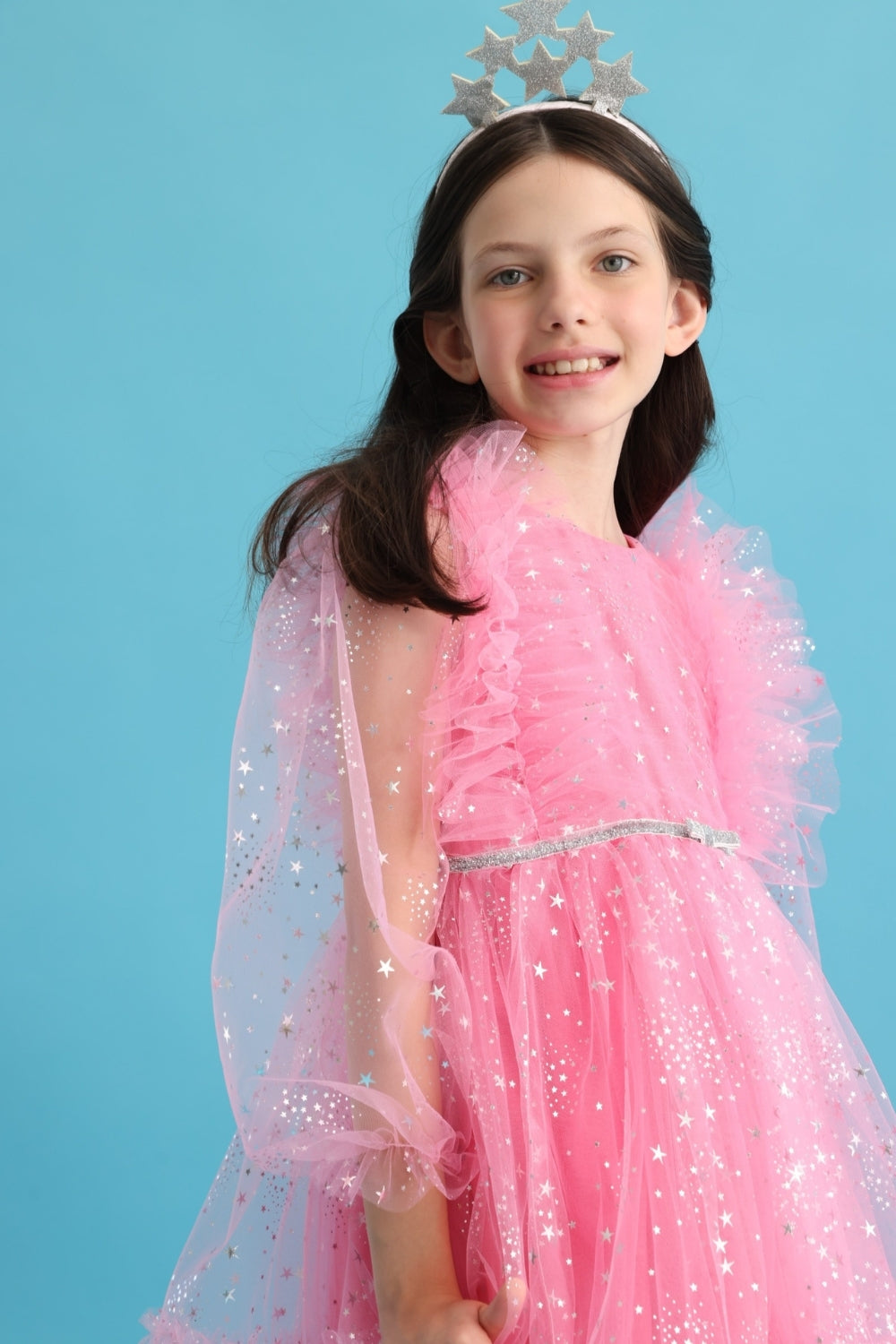 Pembe Omzu Fırfır Detaylı Yıldızlı Kız Çocuk Elbise - Stella
