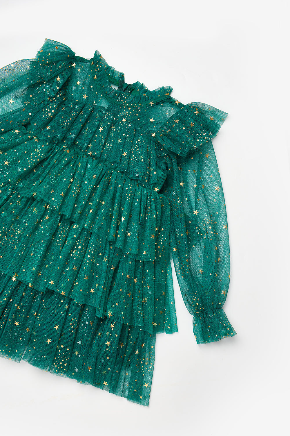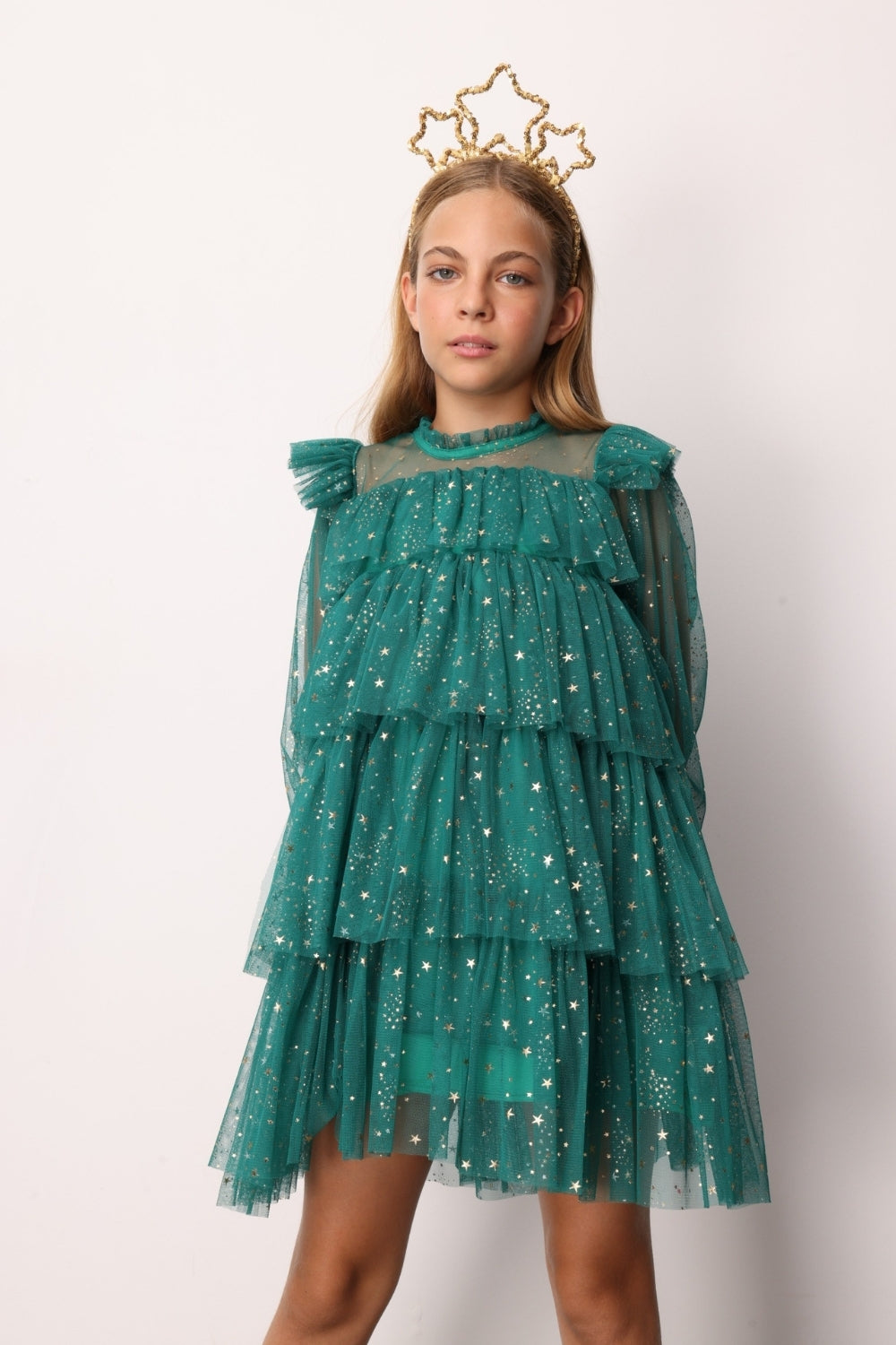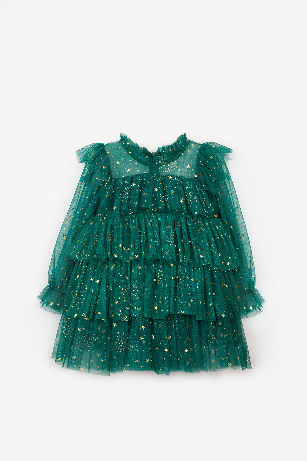 Yeşil Varak Yıldız Baskılı Katlı Kız Çocuk Elbise - Chloe